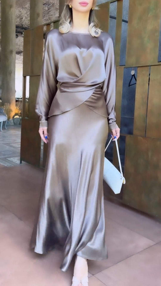 Women's Round Neck Long Sleeve Satin Elegant Dress Suit