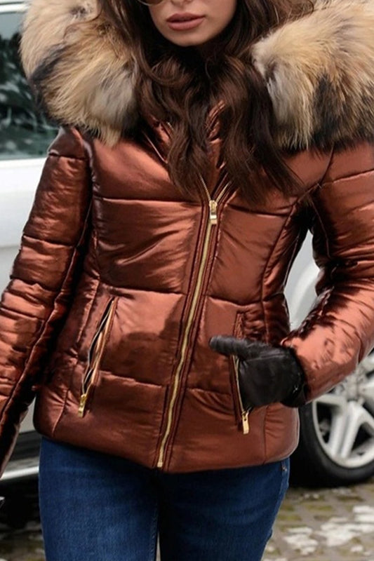 Ladies Casual Glossy Fur Collar Hooded Cotton Coat