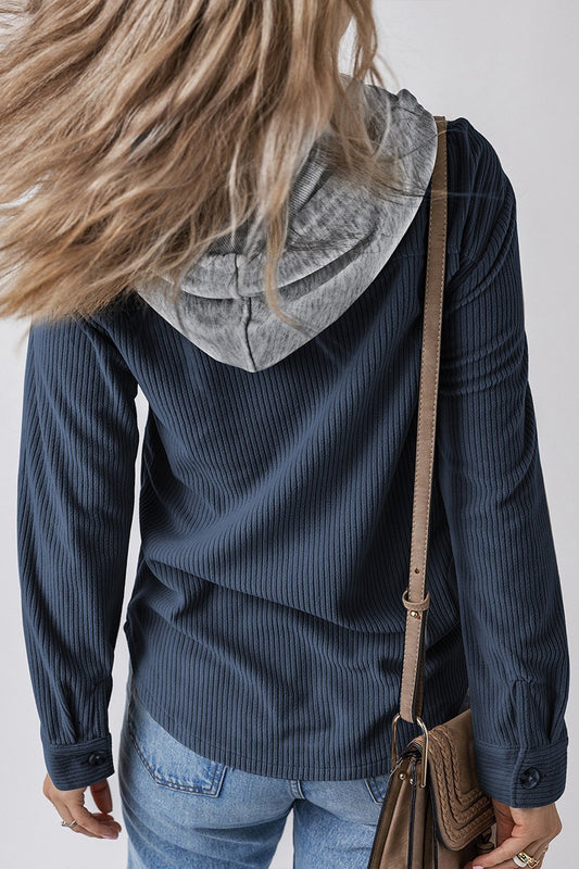 Ladies Lapel Buttoned Cardigan Hooded Drawstring Striped Jacket