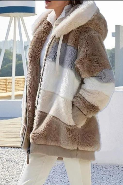 Women's Casual Warm Fur One-piece Hooded Contrast Color Jacket