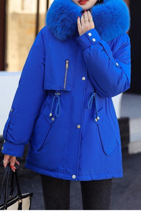 Ladies Casual Solid Color Warm Large Fur Collar Cotton Coat