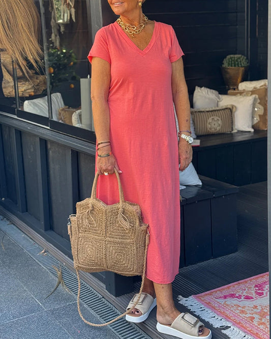 Einfarbiges, langes Kleid mit V-Ausschnitt und kurzen Ärmeln