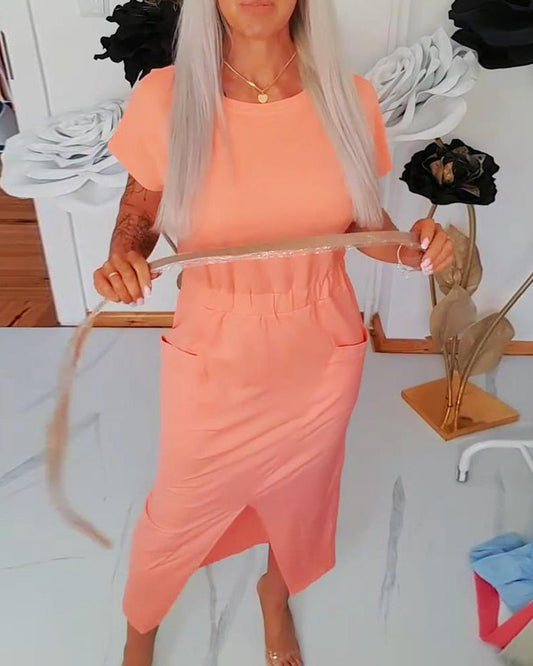 Elegantes, einfarbiges Kleid mit kurzen Ärmeln und Schlitz
