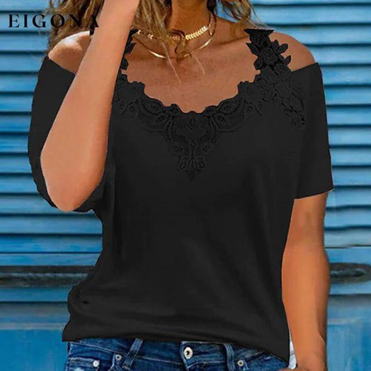 Damen-T-Shirt, einfarbig, Spitze, Knopfleiste, kurze Ärmel