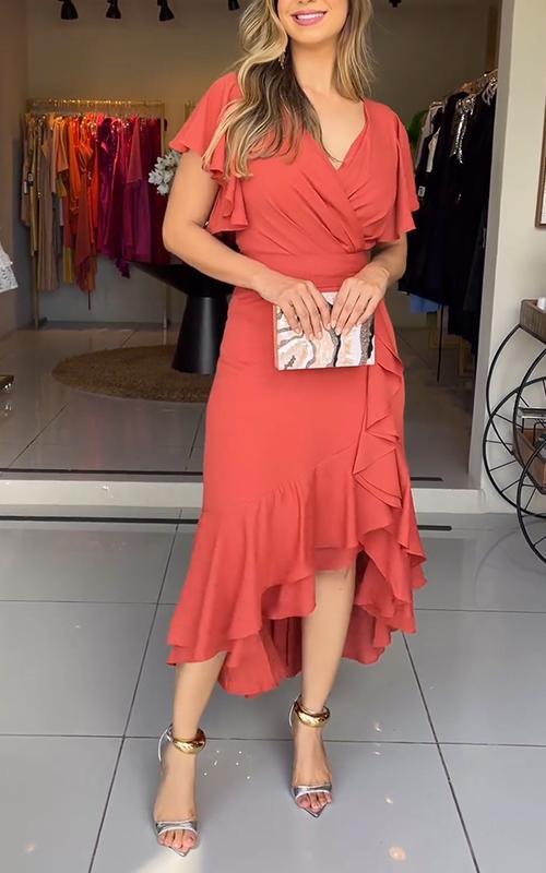Women's V-neck Solid Color Short-sleeved Irregular Dress
