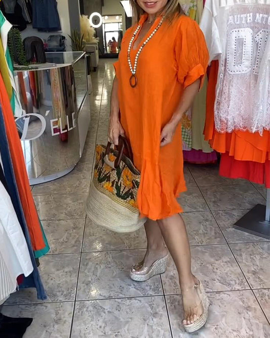 Lantern Sleeve Tie-Drawstring Printed V-Neck Dress