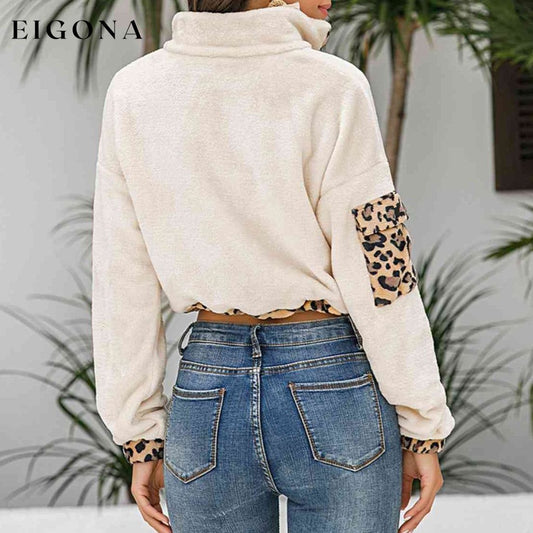 Leopard Half Zip Drawstring Cropped Sweatshirt