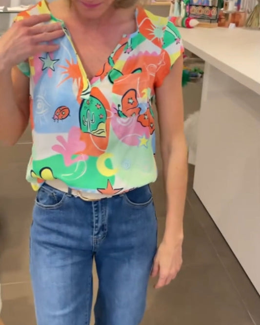 Blusa con mangas raglán y cuello en V con estampado de dibujos animados
