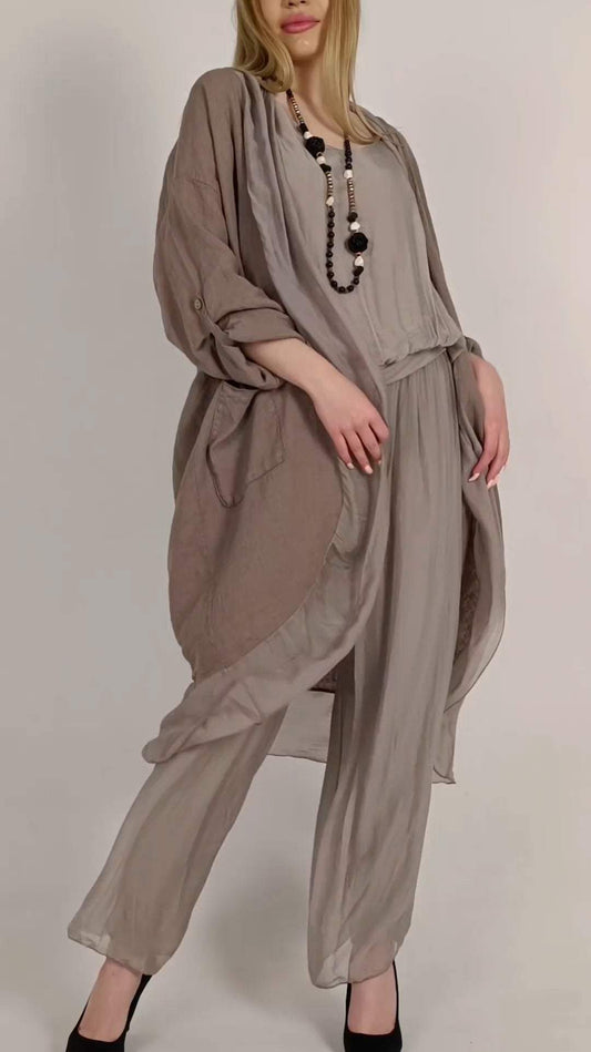 Costume trois pièces en mousseline de soie, col rond, confortable, ample et décontracté, pour femmes