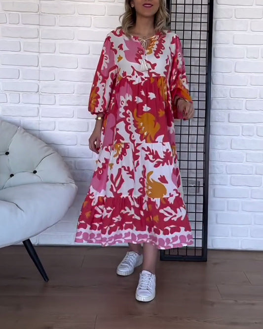 Robe bohème imprimée à lacets et manches ballon