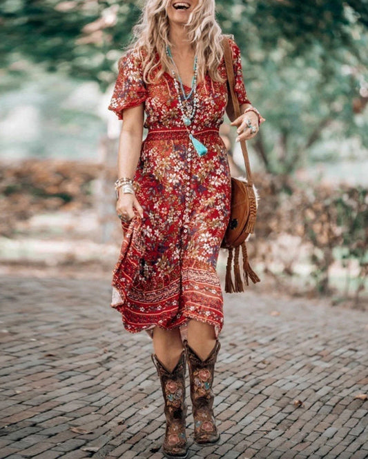 Robe fendue à manches courtes imprimée bohème