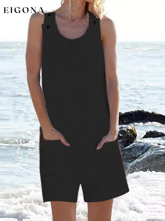 Pantalon à bretelles en coton et lin pour femmes, couleur unie, poche avec bouton inséré, vacances