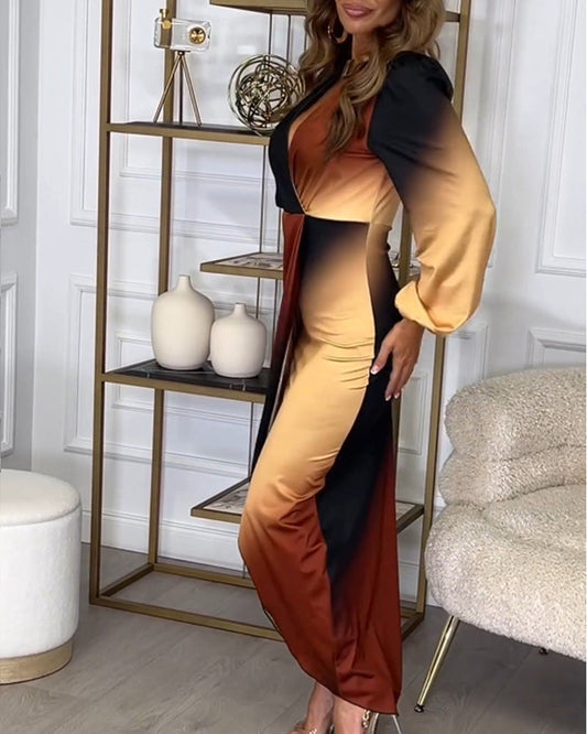 Abito aderente alla moda con maniche lunghe e scollo a V profondo in colore a contrasto