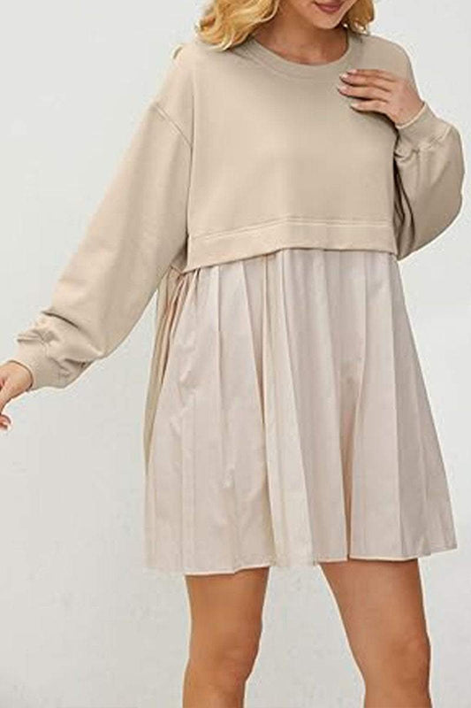 Abito casual da donna con scollo tondo, maniche lunghe e plissettate, patchwork