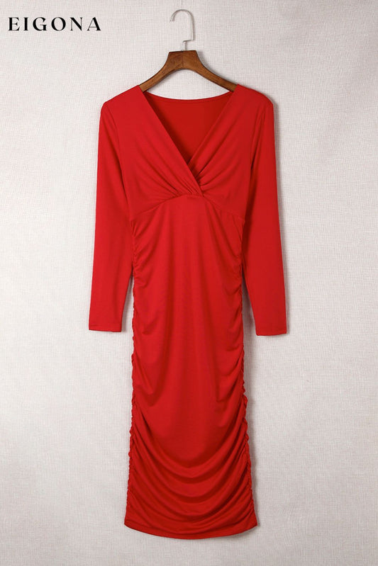 Robe moulante fourreau froncée rouge vif à manches longues et col en V