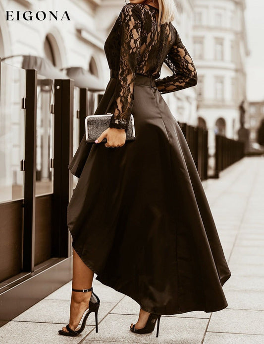 Robe de soirée noire en satin à manches longues et en dentelle à manches longues et hautes