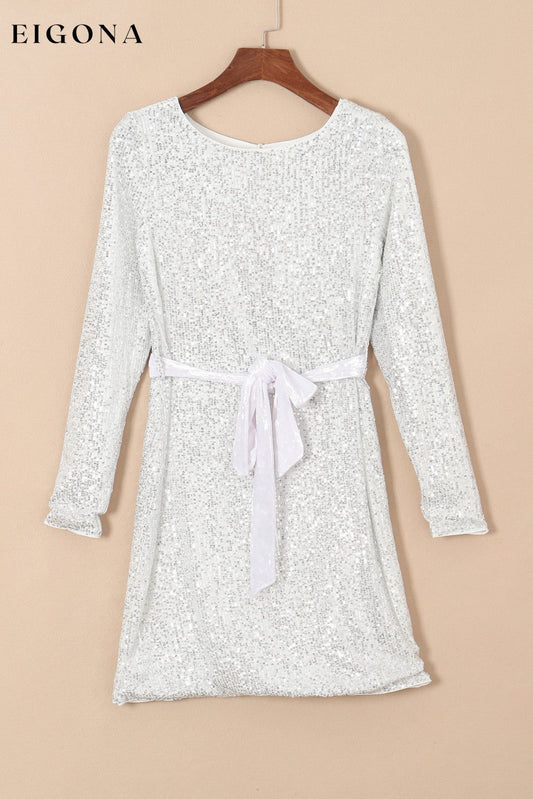 Mini-robe argentée à sequins, manches longues, nouée à la taille