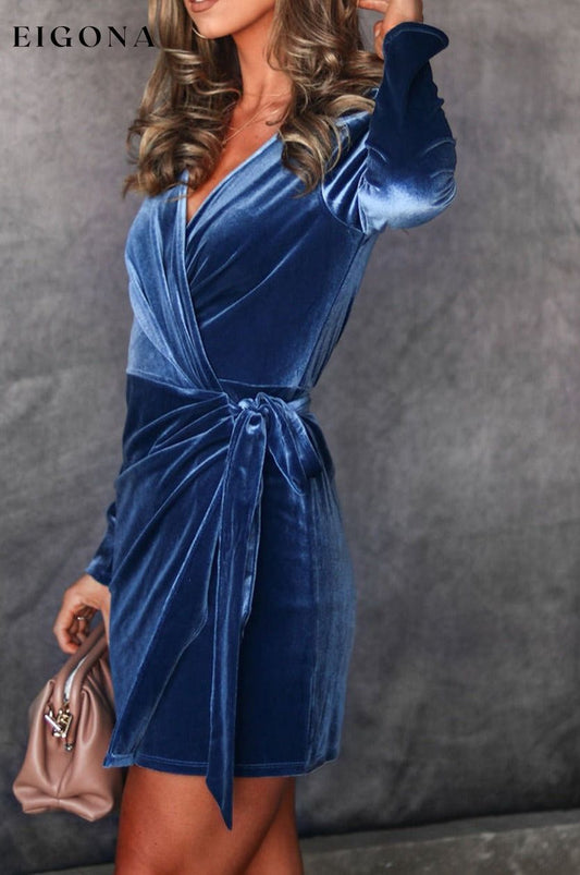 Mini-robe en velours bleu marine avec col en V et manches longues