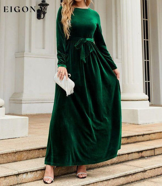 Robe longue à manches longues en velours doré avec ceinture et col rond pour femme