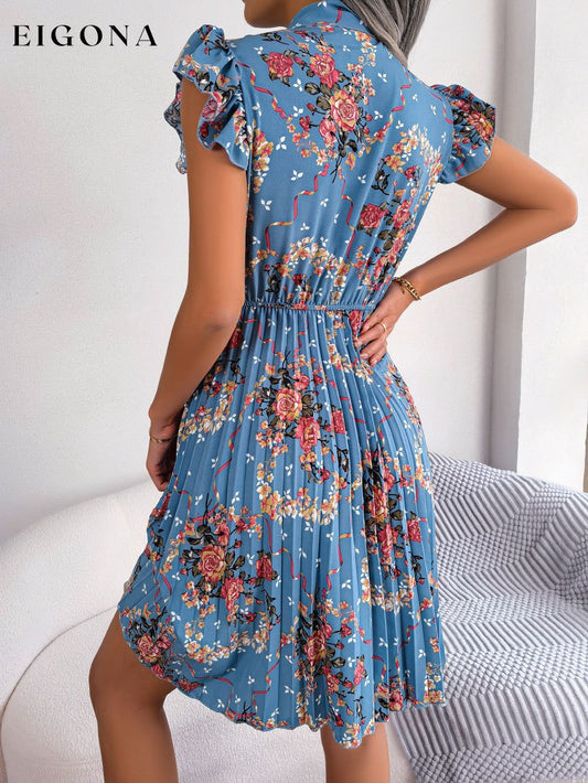 Robe plissée à manches courtes et col noué à imprimé floral, longueur aux genoux