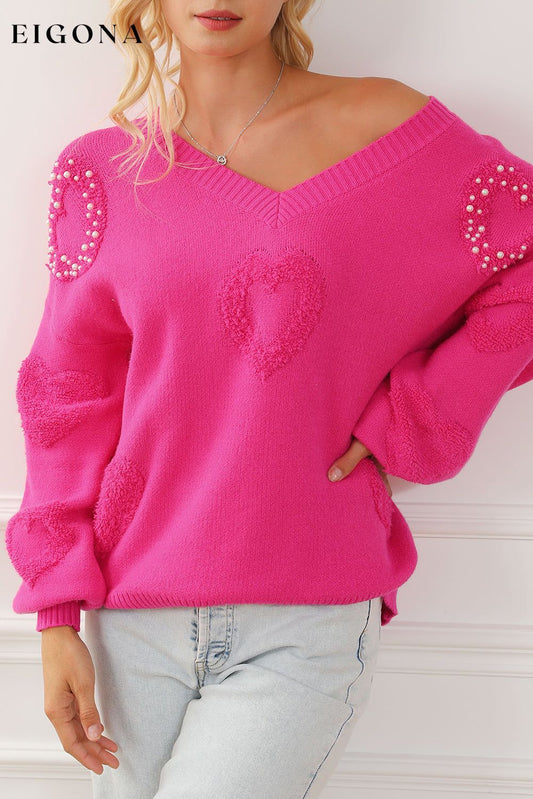 Pull à col en V et cœurs pelucheux ornés de perles rouge rose