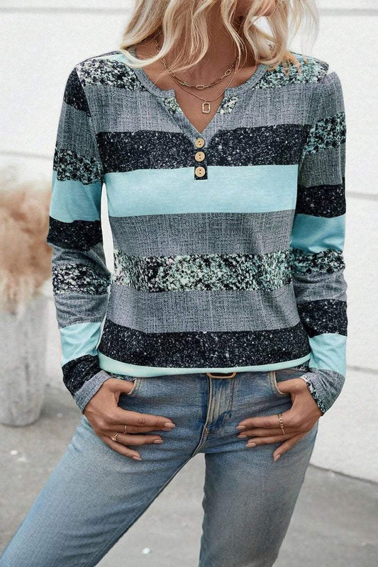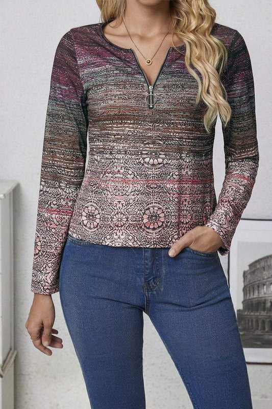 Women's Casual Zipper V-neck Abstract Retro Print Top