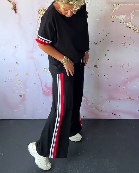 Costume deux pièces décontracté à col rond et imprimé à rayures contrastées