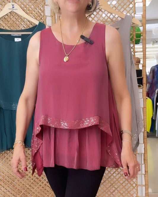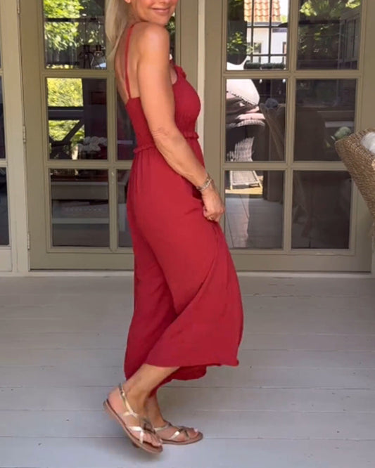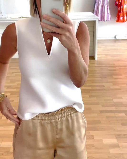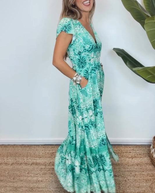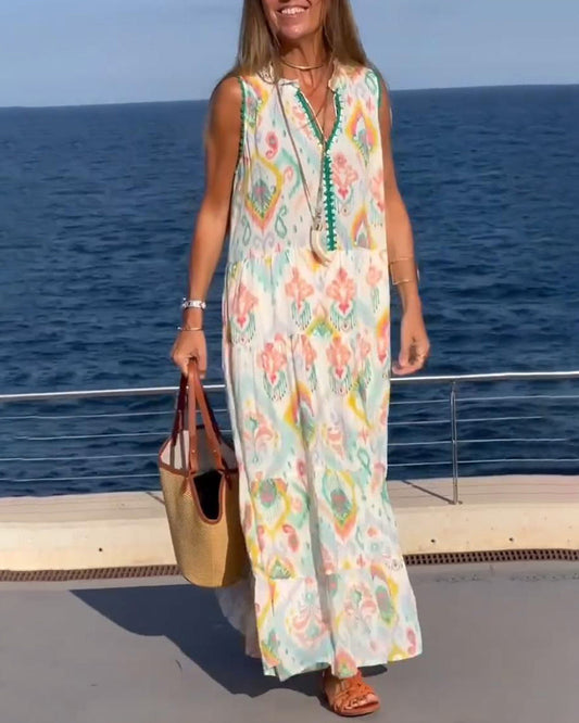 Robe sans manches à col en V et imprimé feuilles à la mode