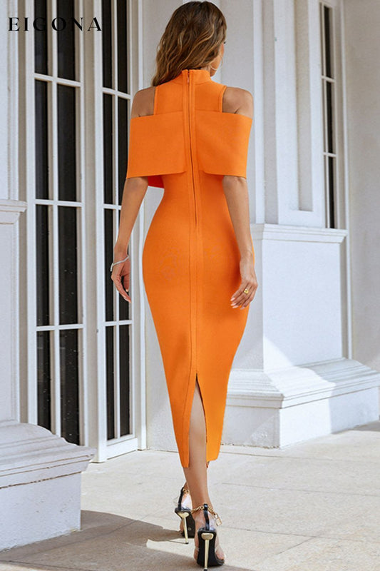 Abito midi con spacco e collo a lupetto con spalle scoperte