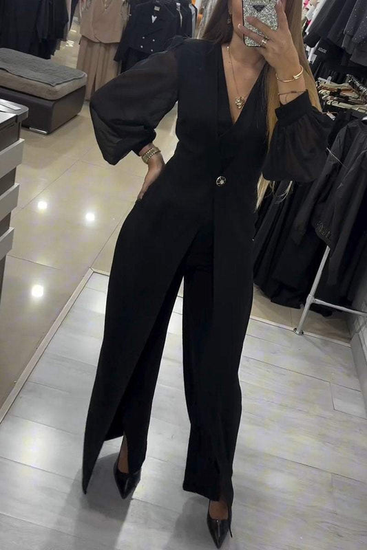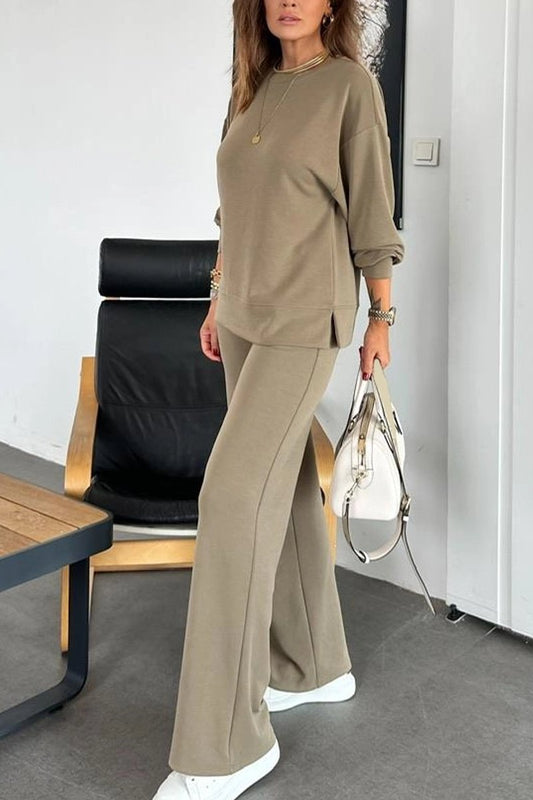 Completo due pezzi da donna con scollo a V e pantaloni tinta unita