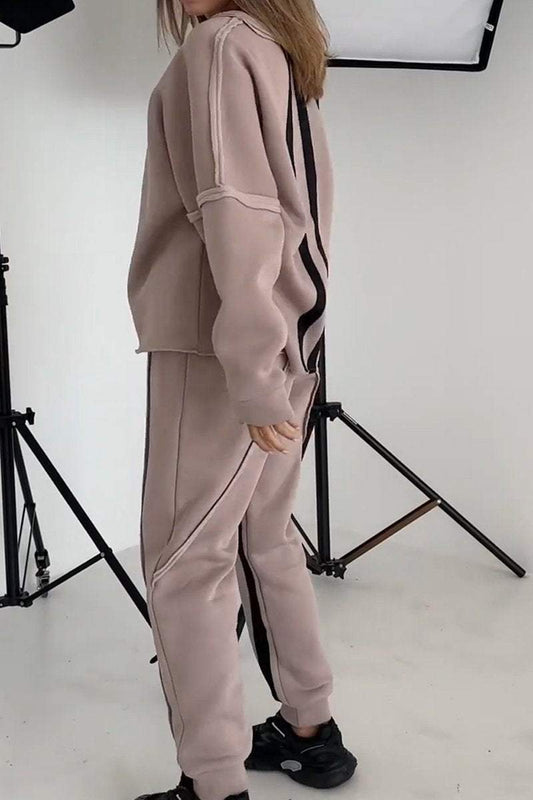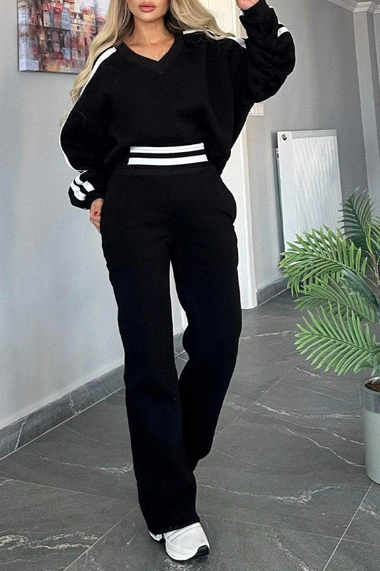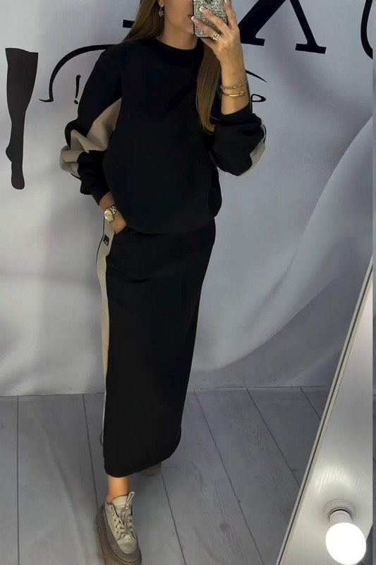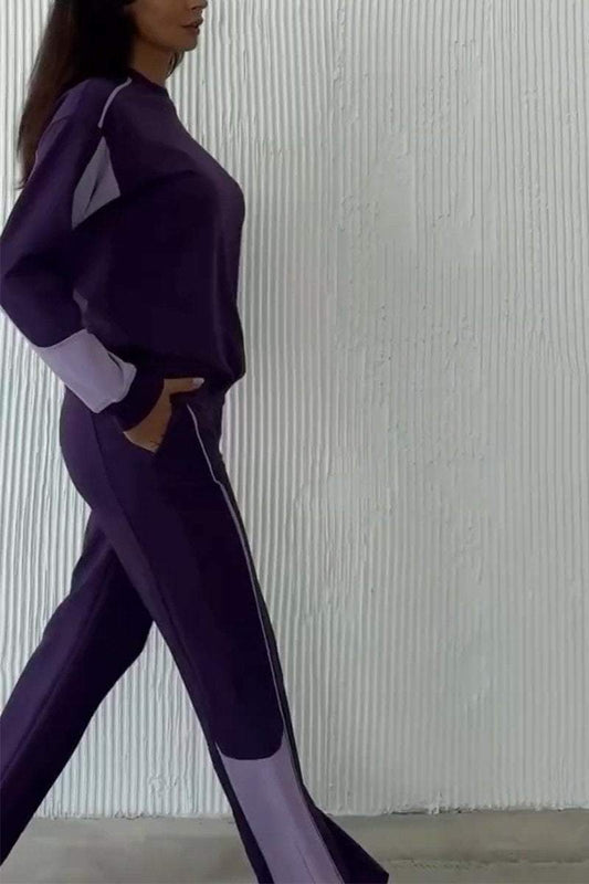 Completo casual da donna a due pezzi con scollo tondo e maniche lunghe a contrasto