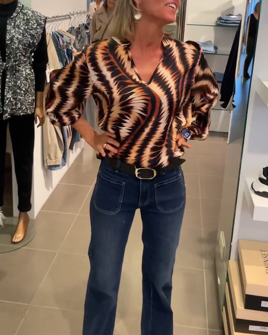Blusa elegante tinta unita con scollo a V e maniche a sbuffo