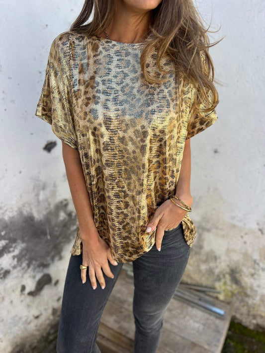 Top da donna con stampa leopardata a maniche corte e scollo tondo