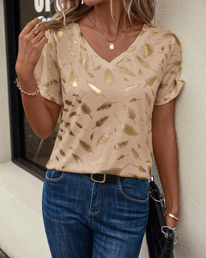 T-shirt casual con stampa a foglie e scollo a V