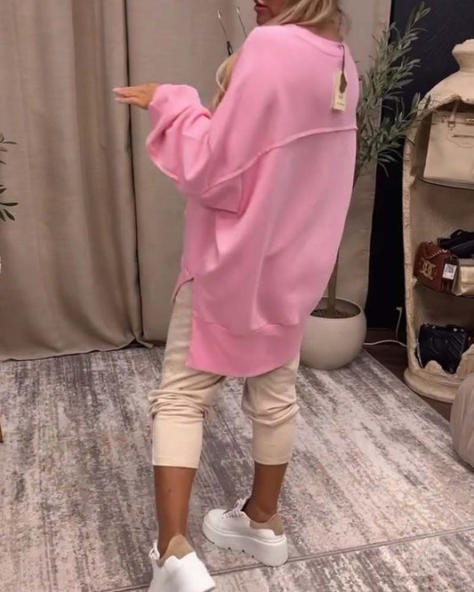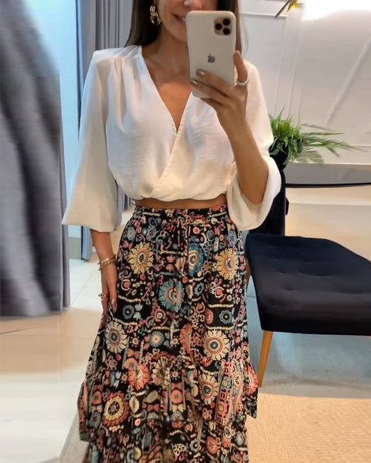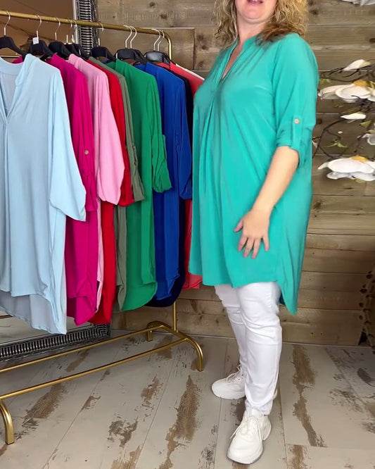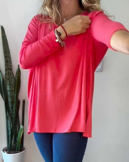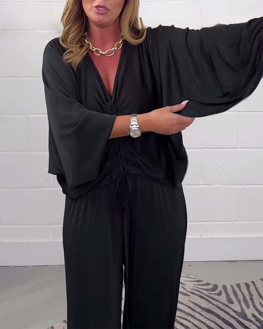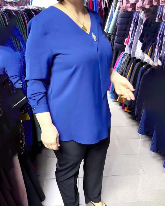 Top elegante con scollo a V, tinta unita, maniche larghe