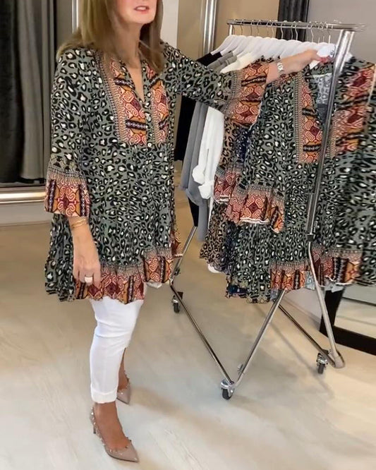 Abito largo a maniche lunghe con scollo a V e stampa vintage