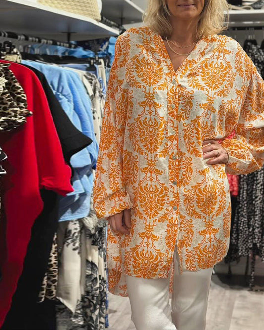 Blusa con bottoni a maniche lunghe e scollo a V con stampa vintage
