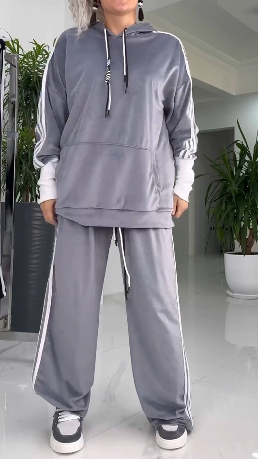Completo pantaloni con cappuccio in velluto a righe a contrasto da donna