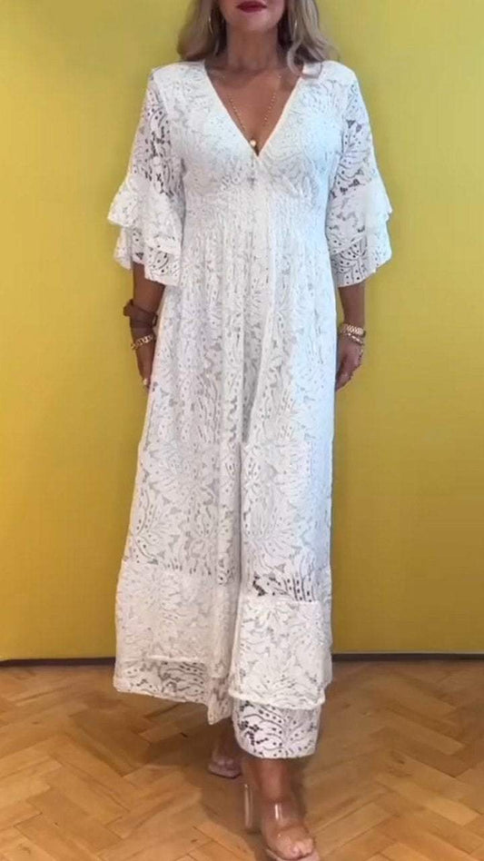 Abito da donna con scollo a V e maniche a tromba in pizzo