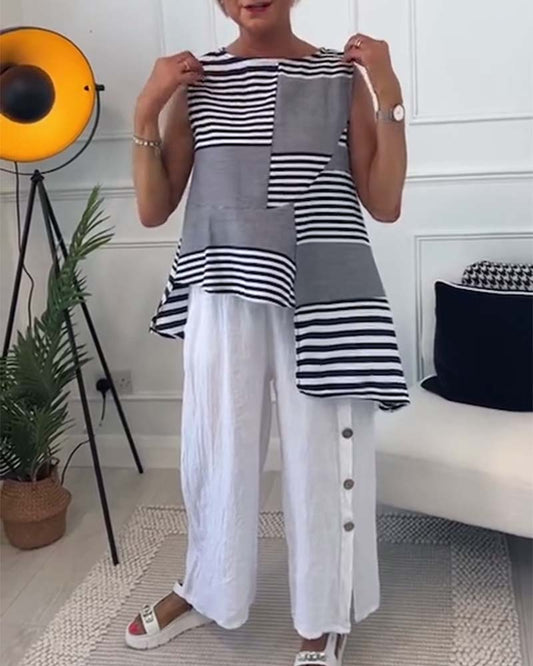 Camicetta senza maniche con scollo tondo stampato con cuciture casual a righe