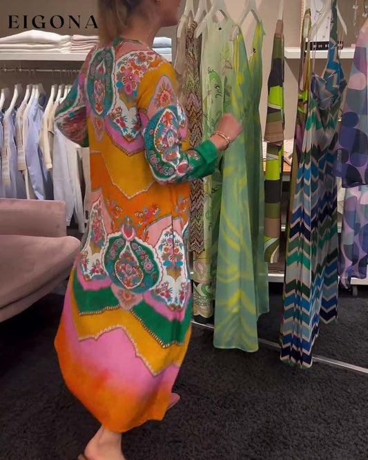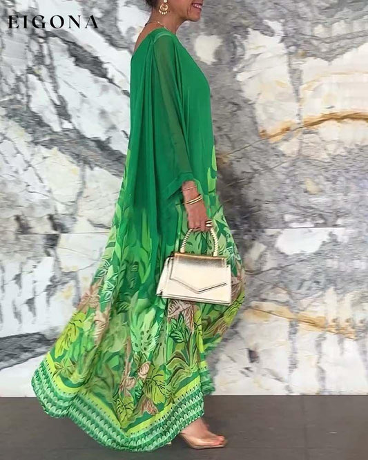Abito lungo ampio con stampa foglie e scollo tondo a maniche lunghe