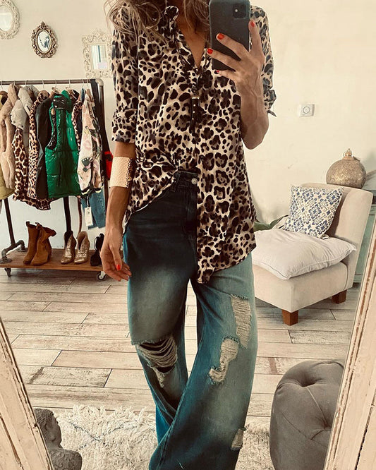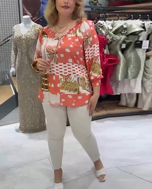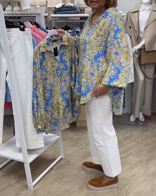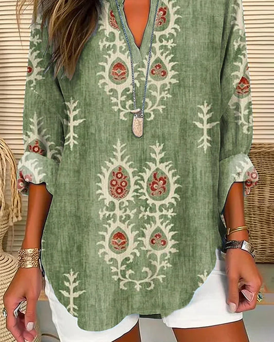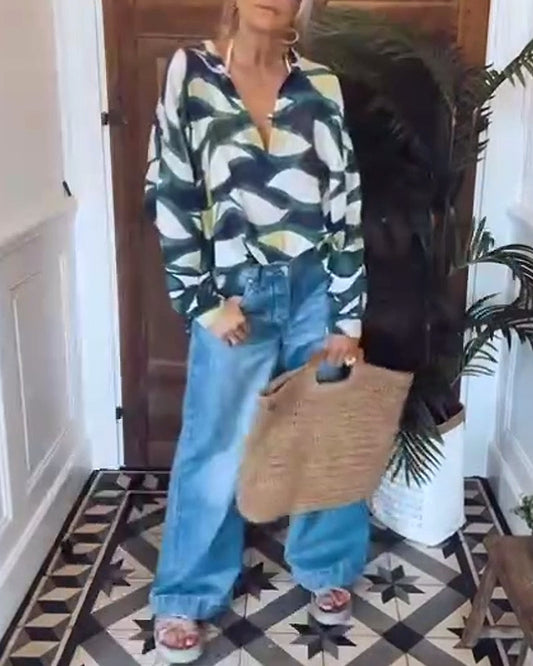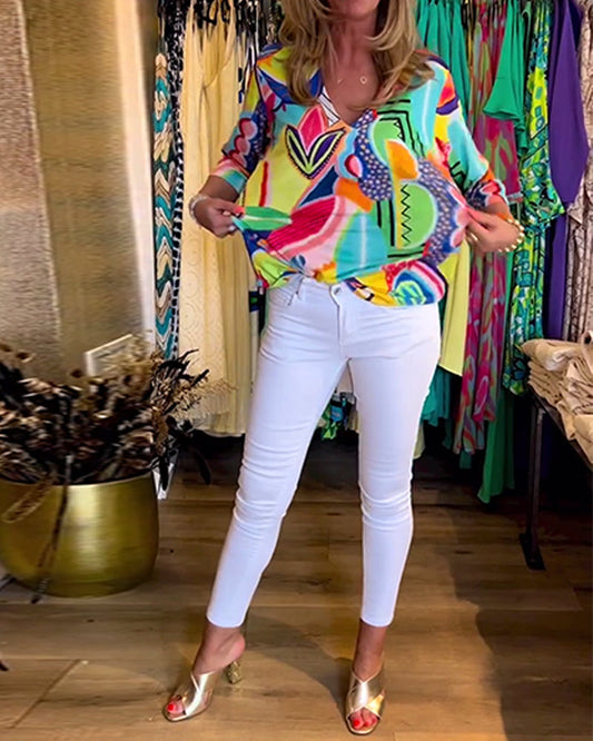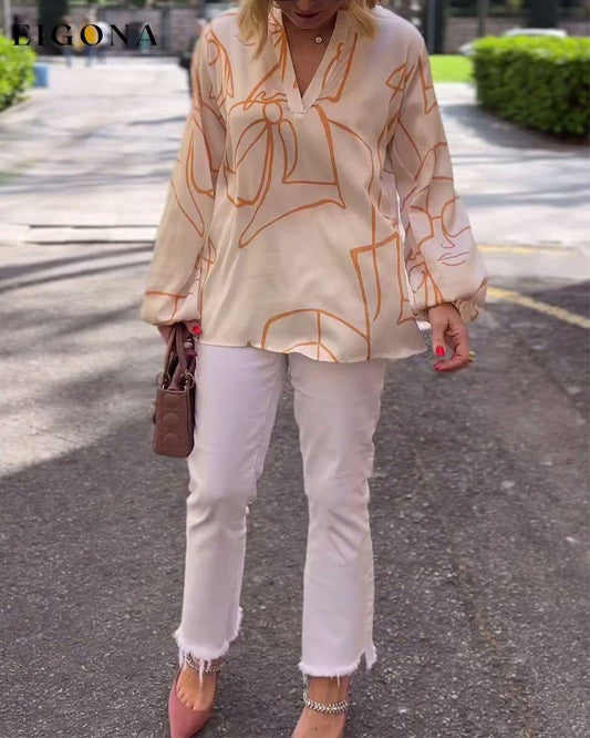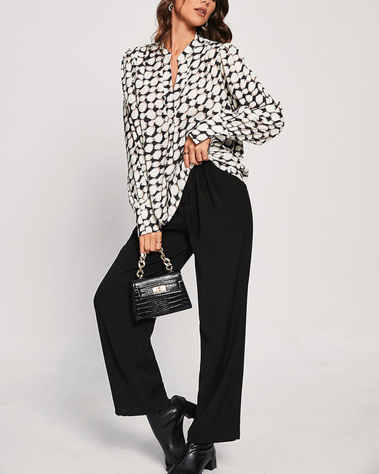 Camicetta ampia a maniche lunghe con scollo a V stampata casual