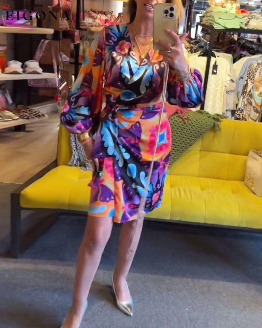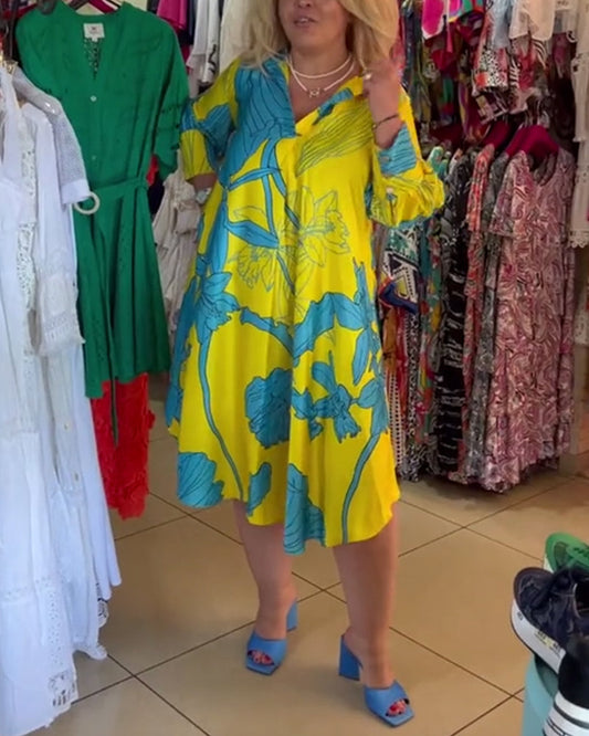 Abito lungo elegante a maniche lunghe con risvolto con stampa floreale