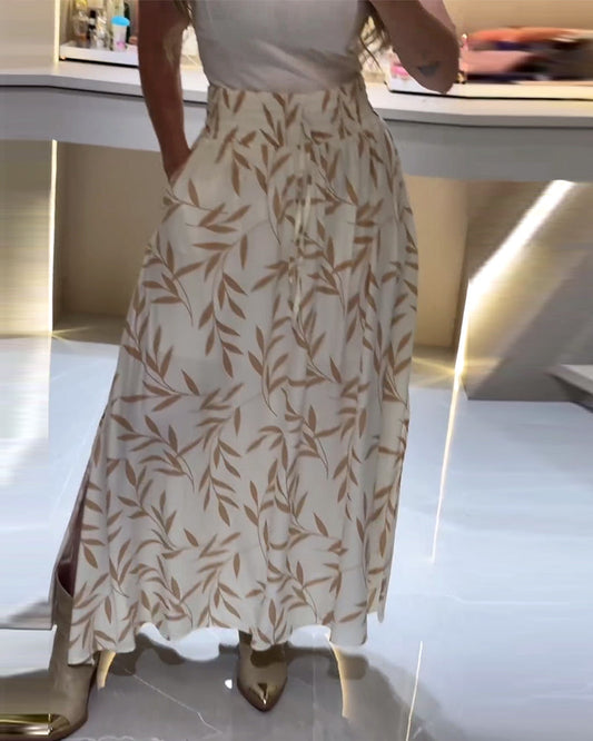 Elastisk midje skjørt med bambusbladtrykk