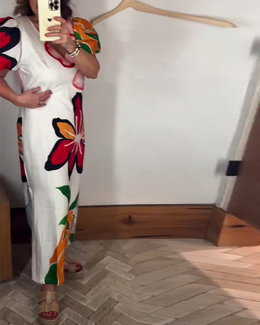 Abito lungo con maniche a sbuffo e scollo a V, stile floreale