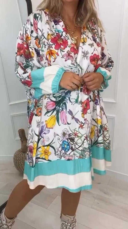 Kvinners uformelle blomsterprint langermet kort kjole