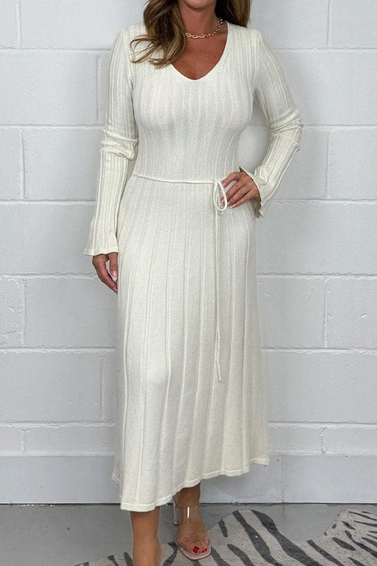Kvinners Ribbet V-hals Langermet Tie Midje Strikket Maxi Kjole