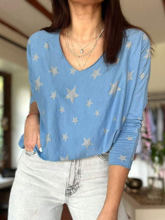 Kvinners uformelle stjernetrykk med rund hals og langermet topp