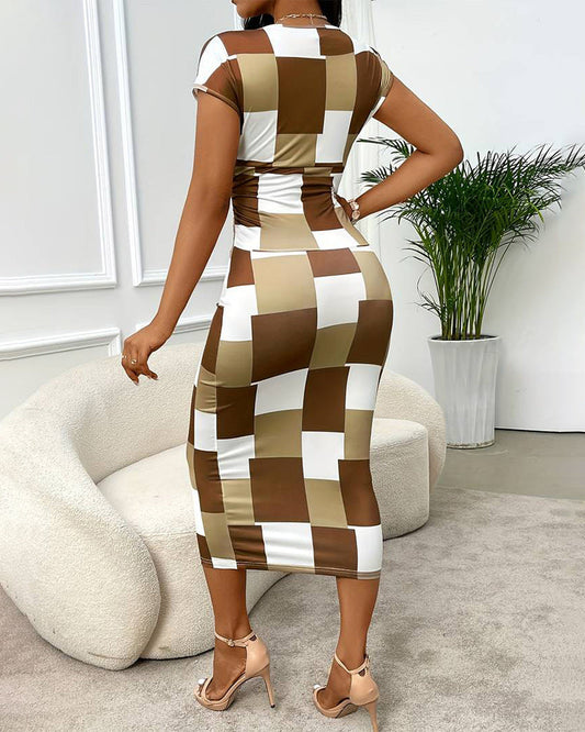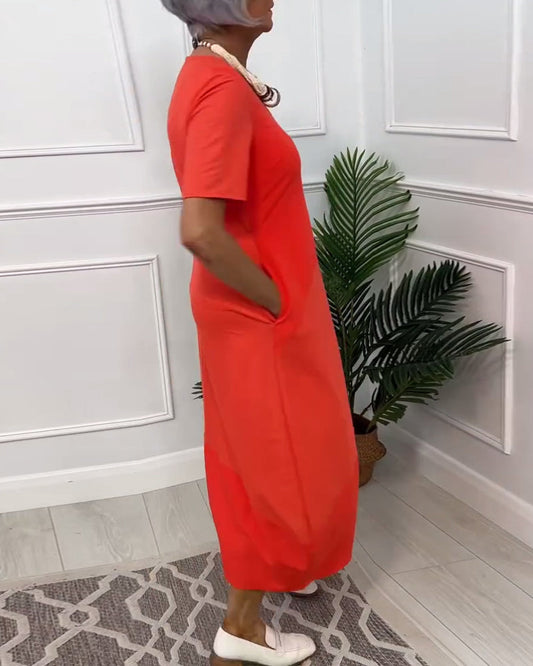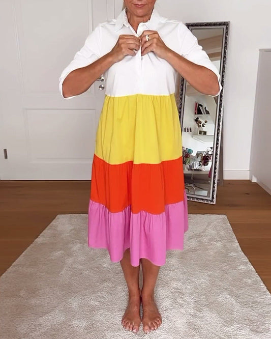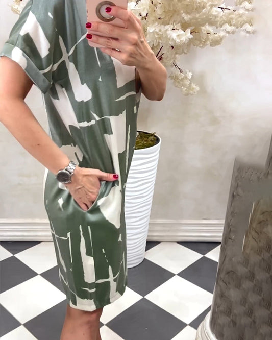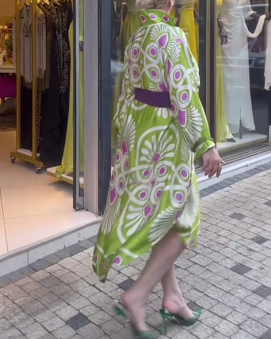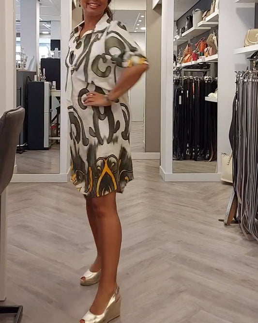 Halv-ermet løs kjole med retrotrykk i jakkeslaget