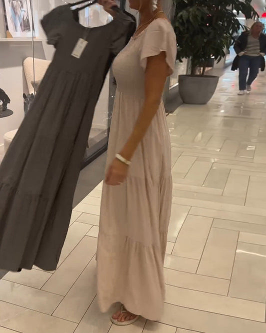 Ensfarget plisseret kjole med firkantet hals og volanger